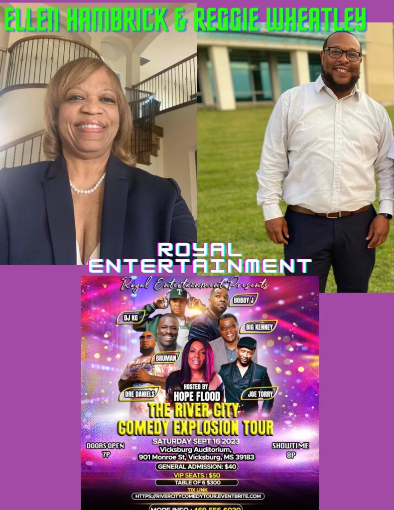 Royal Entertainment’s next event is September 16, 2023 at the Vicksburg auditorium. Guests include but are not limited to Joe Torry, BruMan, Dre Daniels, Big Kenney, Bobby J, DJ KJ, and hosted by Ms. Hope Flood.